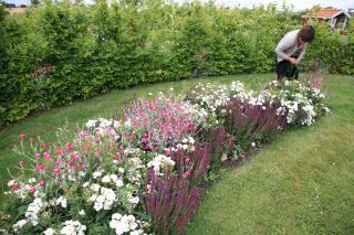 Juli måned - rose White Cover, staudesalvie, haveklinte, akelejer i fuld flor.